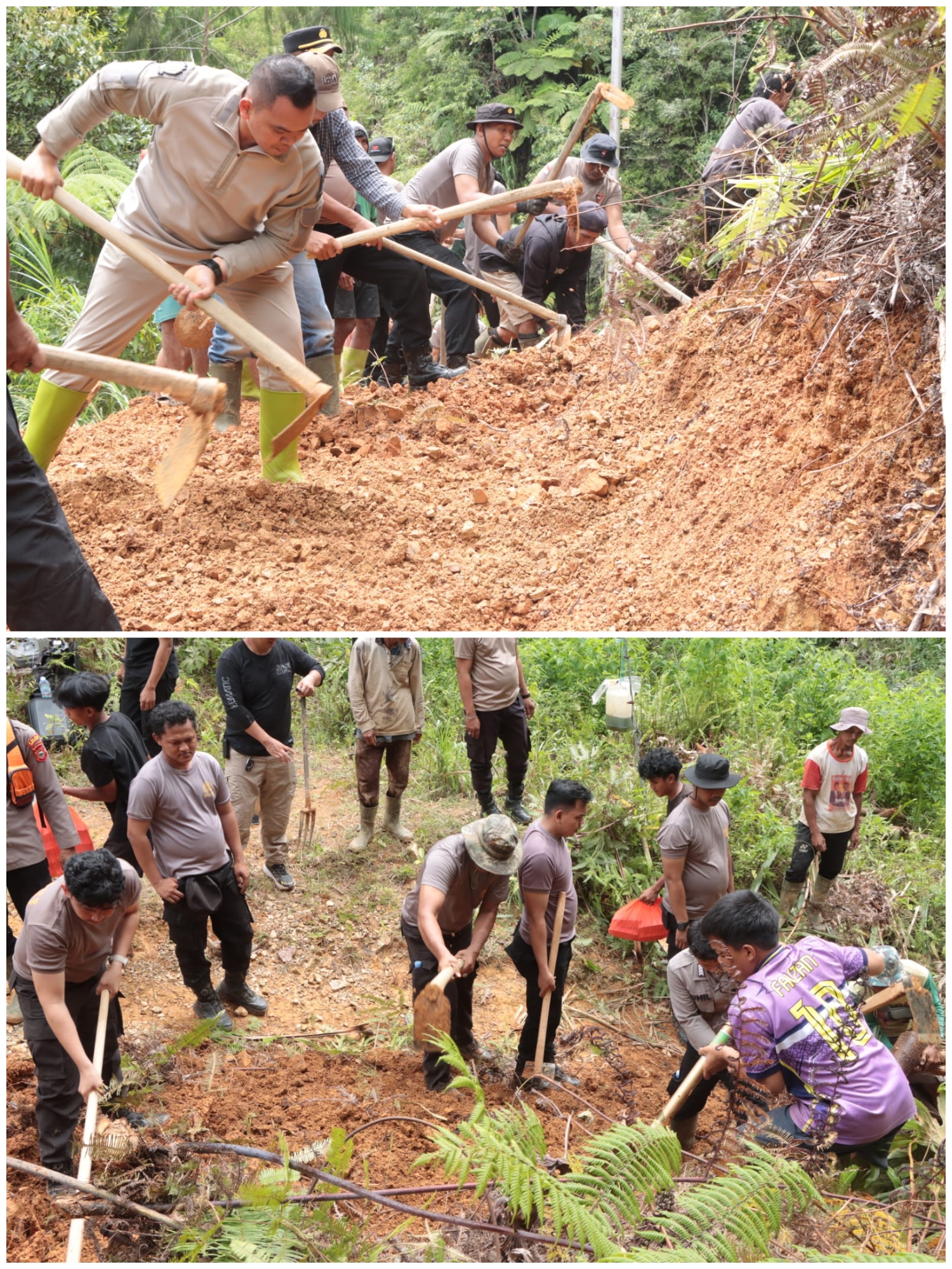 Kapolres Sidrap AKBP Dr. Fantry Taherong memimpin langsung pembersihan material longsor bersama personel Polres Sidrap. Proses perbaikan dilakukan secara gotong royong agar akses jalan bisa segera difungsikan kembali.
