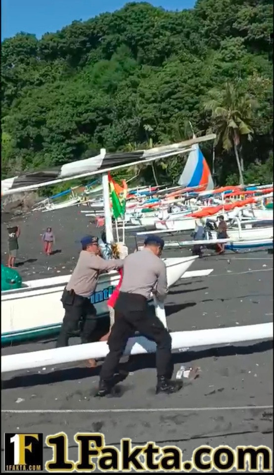 Melihat kondisi tersebut, personel Satuan Polairud Polres Karangasem dengan sigap turun tangan membantu para nelayan mendorong jukung hingga berhasil menepi ke pantai.