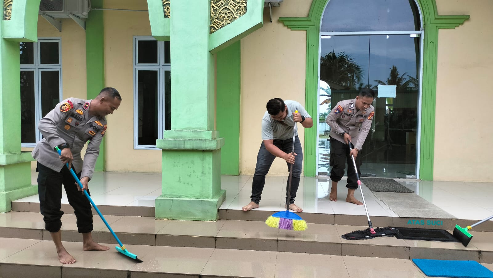 Dipimpin langsung oleh Kapolsek Kerumutan IPDA M. Ali Sodiq, S.Psi bersama dengan 10 personel Polsek, giat ini diawali dengan gotong royong bersama jamaah dan warga sekitar masjid membersihkan halaman serta area dalam masjid.
