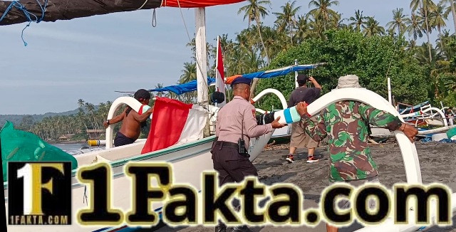 Melihat kondisi tersebut, personel Satuan Polairud Polres Karangasem dengan sigap turun tangan membantu para nelayan mendorong jukung hingga berhasil menepi ke pantai.