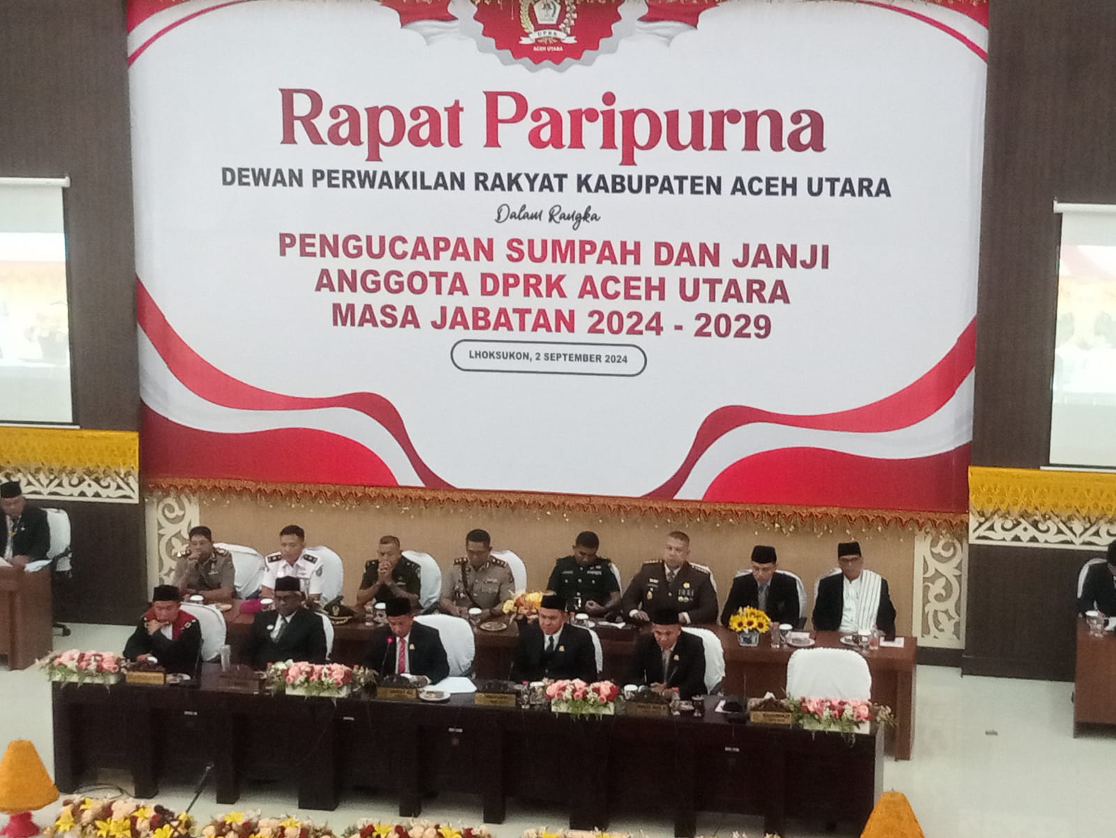 Pengucapan sumpah dan janji anggota DPRK Aceh Utara yang terpilih dalam Pemilu Legislatif 14 Februari 2024 lalu dipimpin Ketua Pengadilan Negeri Lhoksukon Ngatemin, SH MH. Dilanjutkan prosesi peusijuek (tepung tawar) oleh Ketua Majelis Adat Aceh (MAA) Kabupaten Aceh Utara Drs. Usman M.Pd.