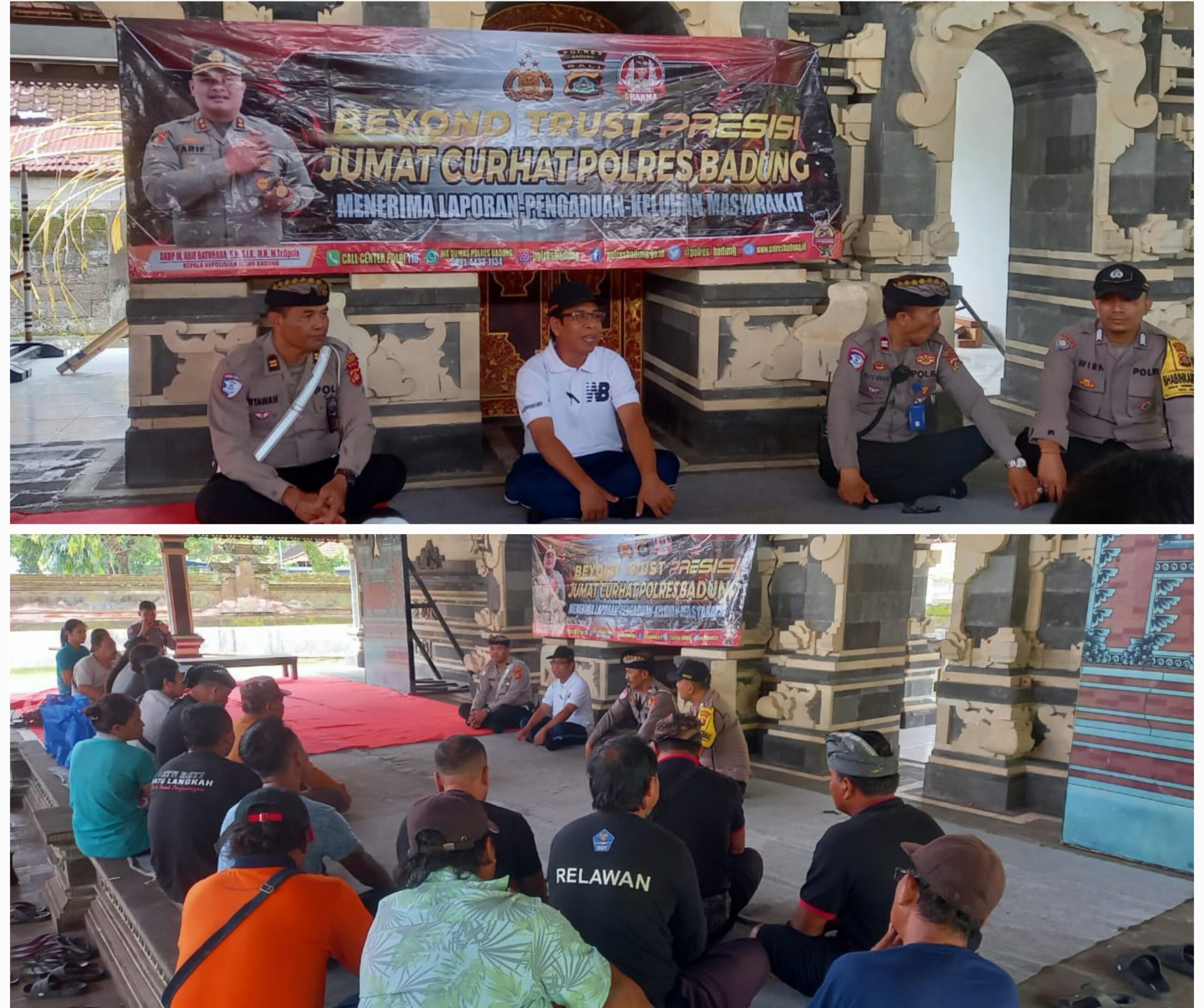 Mangupura – 1fakta.com | Guna menciptakan situasi kamtibmas yang kondusif Polres Badung menggelar Jumat Curhat yang merupakan salah satu program unggulan dari Kapolri (Program Beyond Trust Presisi), Kegiatan Jumat Curhat ini sebagai bagian dari upaya mendekatkan diri dengan masyarakat dan mendengarkan langsung aspirasi serta keluhan warga. Kegiatan kali ini diadakan di Wantilan Pura Puseh Desa Adat Werdibuana, Kecamatan Mengwi Kabupaten Badung, Bali. Jumat, 31 Januari 2026 Siang.