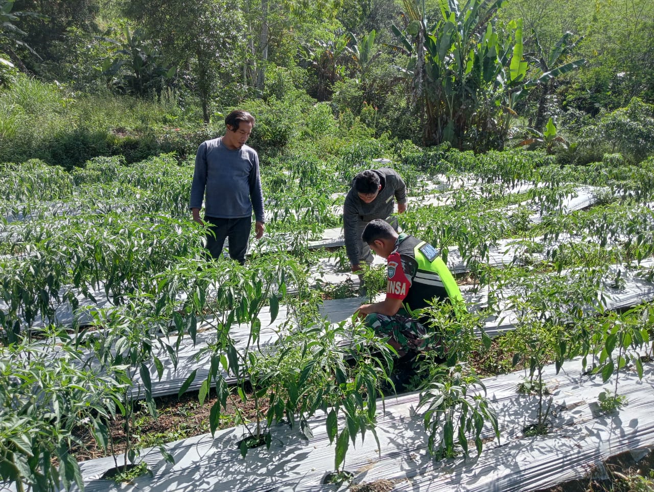 Anggota Koramil 05/ linge Kopda Pasdi Pitra membantu perawatan tanaman cabe milik bapak Hamdan di desa kute robel.Kec.linge Kab.Aceh Tengah.Rabu (30/10/24)