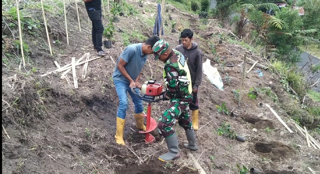 Anggota Babinsa Koramil 02/Bebesen Sertu Kasnari melaksanakan Komsos sekaligus membantu kelompok tani Warga Tapak Moge Menggali tanah dengan alat Bor tanah Sangat Simpel dan Efisien.