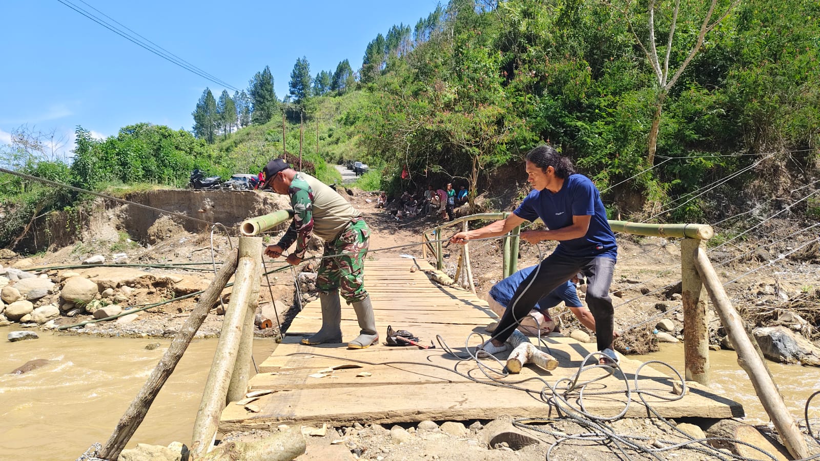 Anggota Koramil 08/Silih Nara bersama masyarakat melaksanakan kegiatan gotong royong pembuatan jembatan darurat di Desa Terang Engon, Kecamatan Silih Nara, Kabupaten Aceh Tengah, pada Selasa (24/01/2026).