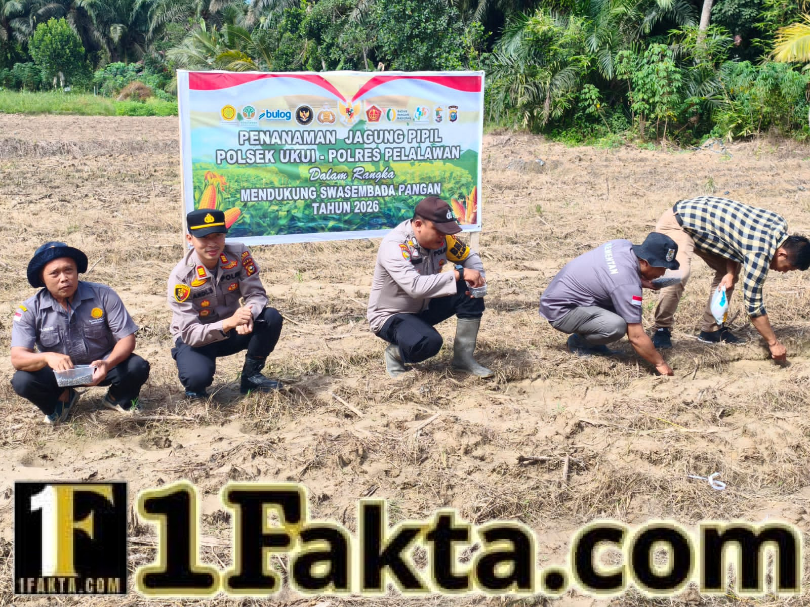 Dalam upaya mendukung program ketahanan pangan, Polsek Ukui bersama Kelompok Tani (KT) Cinta Tani melaksanakan kegiatan penanaman jagung pipil Kuartal I Tahun 2026 di Desa Bukit Gajah, Kecamatan Ukui, Kabupaten Pelalawan, Rabu (22/4/2026) pagi.