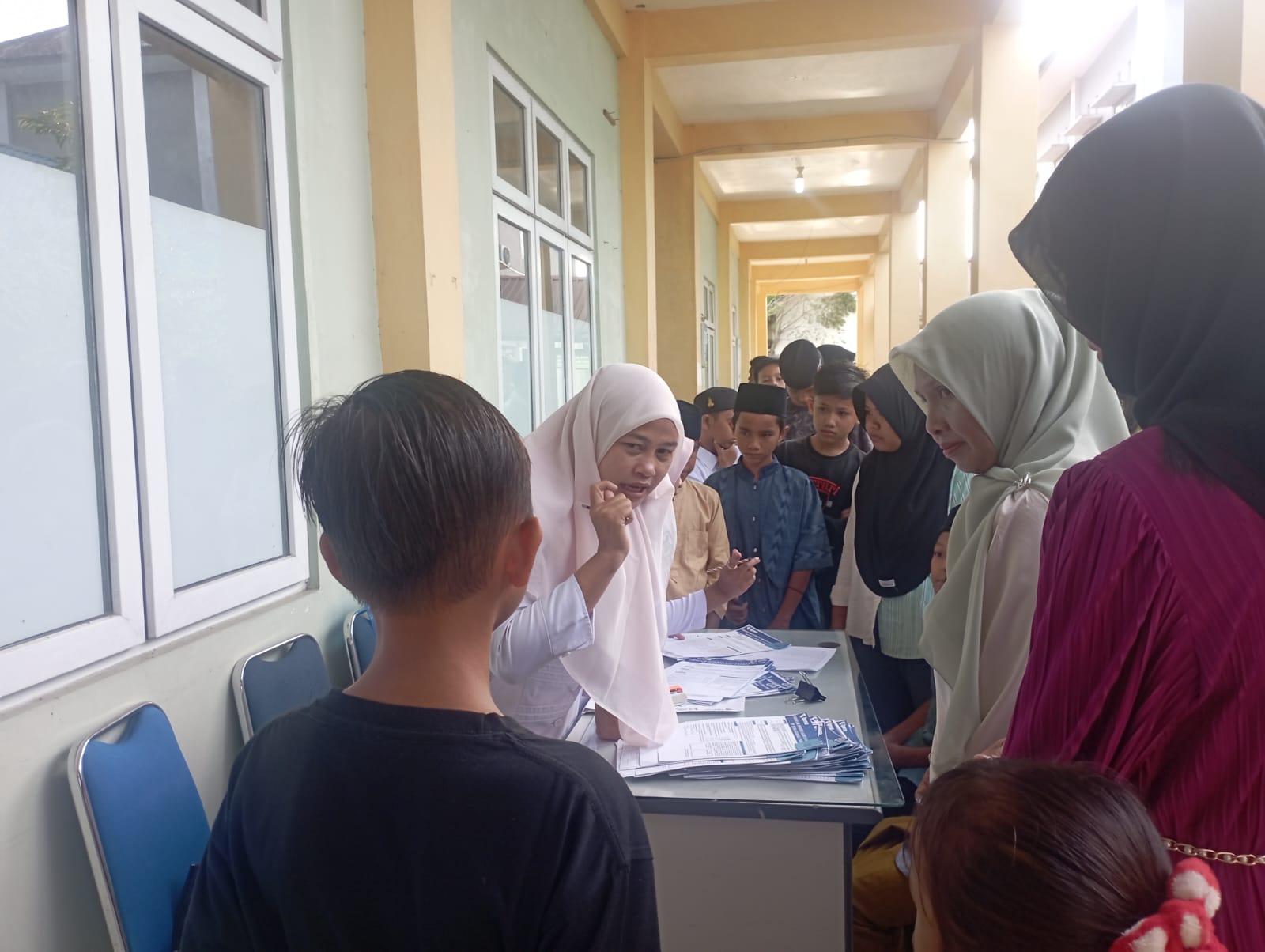 Di halaman Puskesmas Syamtalira Aron, Rabu pagi (25/02/2026), kursi-kursi plastik berderet menghadap meja registrasi. Anak-anak mengenakan sarung dan peci duduk berdampingan dengan orangtua mereka. Sebagian tampak tegang, sebagian lain berusaha mencairkan suasana dengan gurau kecil.