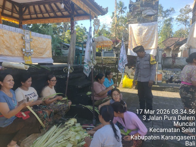 Bhabinkamtibmas Desa Muncan, Polsek Selat Aipda I Nengah Merta Yasa, Melaksanakan Sambang dilanjutkan dengan Penyerahan Bantuan Ungkulan Tedung Agung yang di terima langsung oleh Pengelingsir Pura. I Made Rai. Pada Selasa, 17 Maret 2026.