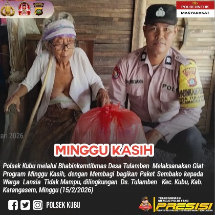 Dalam rangka meningkatkan kedekatan dengan masyarakat dan meringankan beban warga, Polsek Kubu Polres Karangassm melalui Bhabinkamtibmas Desa Tulamben Aiptu I Gede Widiana menyalurkan bantuan sembako kepada warga binaan kurang mampu di lingkungan Desa Tulamben, Kubu, Karangasem. Pada Minggu. (15/2/2026).