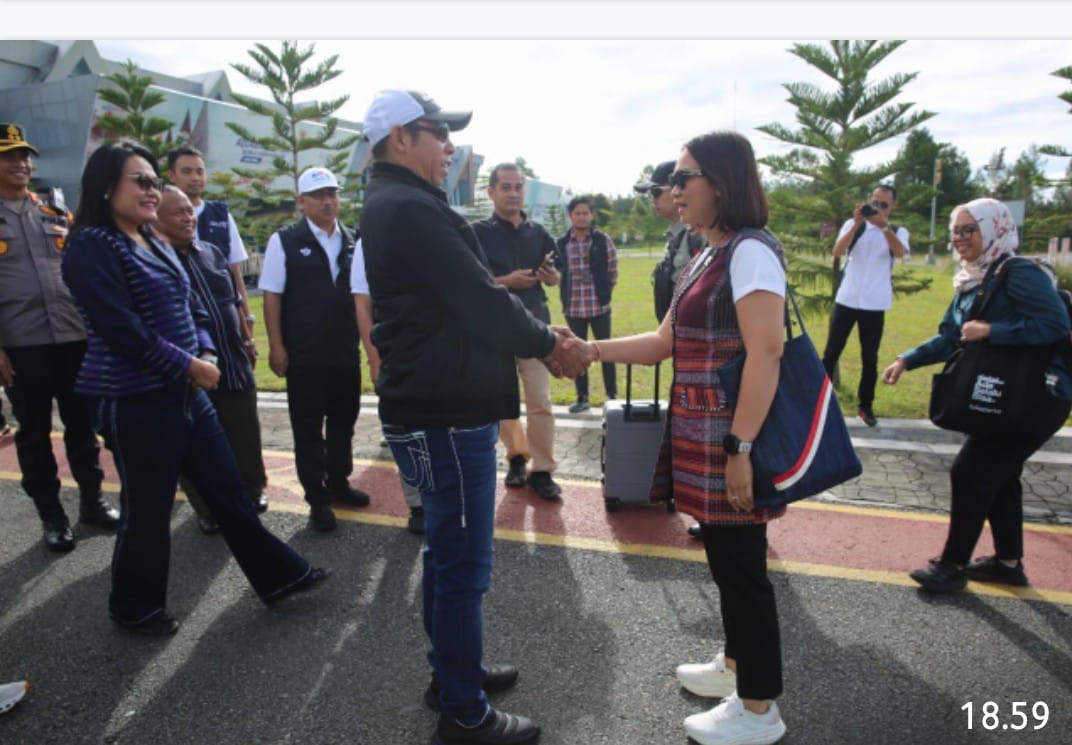 Bupati Tapanuli Utara Dr. Jonius TP Hutabarat, S. Si., M. Si dan Ketua TP. PKK Taput Ny. Neny Angelina JTP Hutabarat Br Purba sambut kunjungan kerja Wakil Menteri Pariwisata RI (Wamenpar) Ni Luh Puspa di Bandara Silangit, Siborong-borong, (Minggu, 4 Mei 2025)