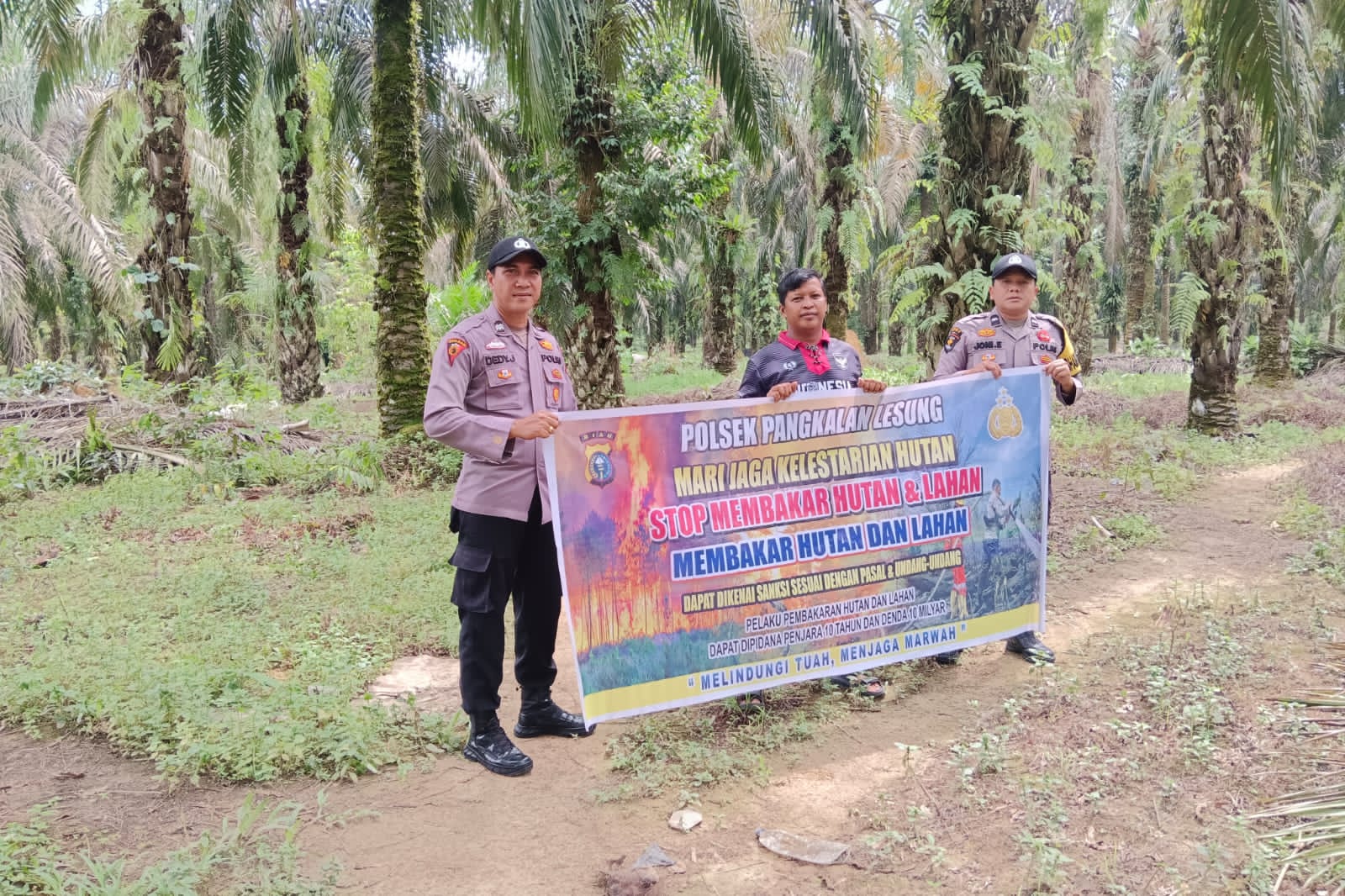 Personel Polsek Pangkalan Lesung melaksanakan patroli daerah rawan kebakaran hutan dan lahan (Karhutla) serta sosialisasi Maklumat Kapolda Riau terkait larangan membuka lahan dengan cara membakar, Rabu (14/1/2026).