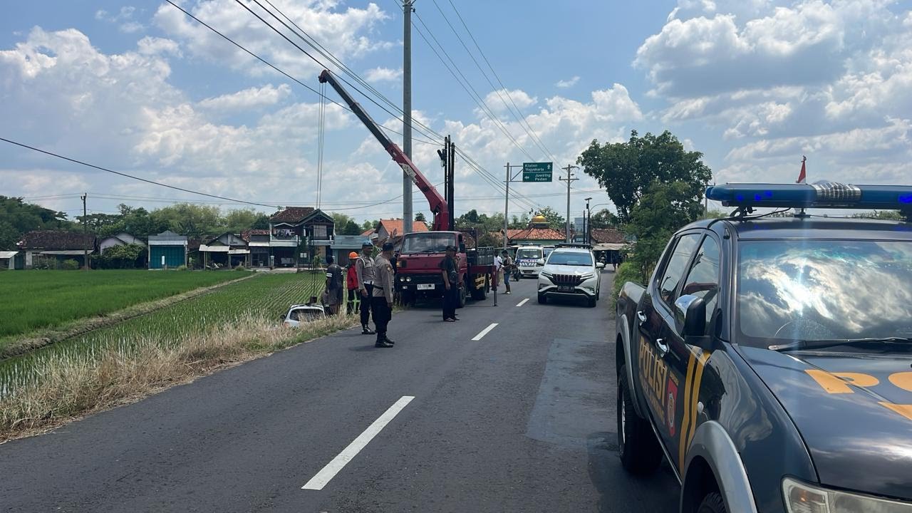 Klaten ll 1Fakta.com – Satu unit mobil terjun ke sawah sedalam 3 meter dari tepi jalan di Desa Jaten, Kecamatan Juwiring, Rabu (15/10/2025). Diduga, kecelakaan tunggal itu terjadi lantaran sopir mengantuk.