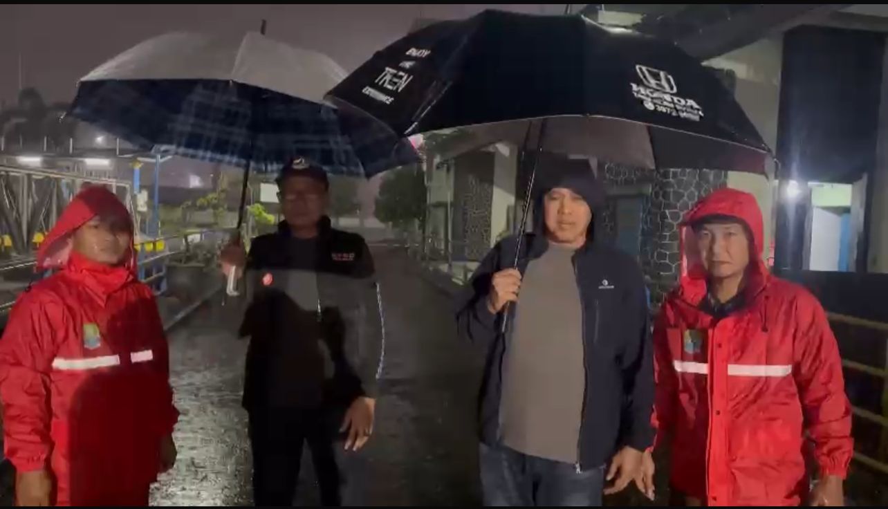 Dengan jaket hujan yang sudah setengah kuyup, ia mengamati debit air yang mulai meninggi. Wajahnya serius, sesekali berbicara dengan petugas yang berjaga.