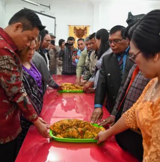 Sebagai tanda doa dalam tradisi adat Batak, keluarga Toga Marbun memberikan “Dekke, Ulos dan Manjomput Parbue Pir” kepada Bupati Humbahas Dr Oloan P. Nababan dan Wakil Bupati Humbahas Junita Rebeka Marbun SH M.AP.