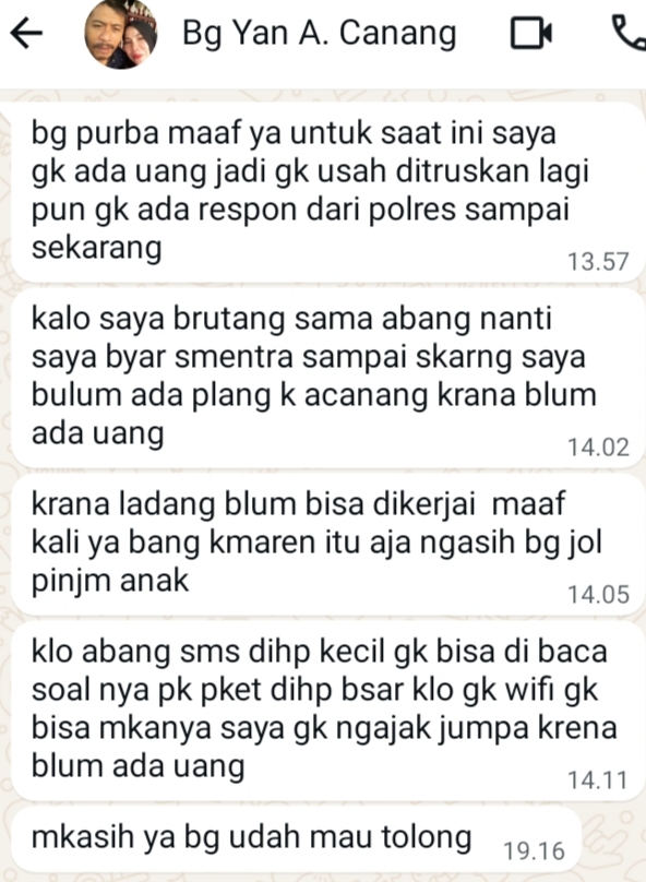 Melalui chat whatsapp milik korban berinisial “A bin alm T”, dengan nomor selularnya itu. Di 082278xxxx93, korban mengatakan. “bg maaf ya, untuk saat ini saya gk ada uang. Jadi gk usah ditruskan, lagi pun gk ada respon dari polres sampai sekarang, kalo saya brutang sama abang nanti saya byar smentra sampai skarng saya bulum ada plang k acanang krana blum ada uang. Karena ladang blum bisa dikerjai, maaf kali ya bang kmaren itu aja ngasih bg jol pinjm anak. klo abang sms dihp kecil gk bisa di baca soal nya pk pket dihp bsar klo gk wifi gk bisa mkanya saya gk ngajak jumpa krena blum ada uang”. Tuturnya, korban kepada wartawan media ini. Kemarin, 6/01/2026 sekitar pukul.14.11.wib.