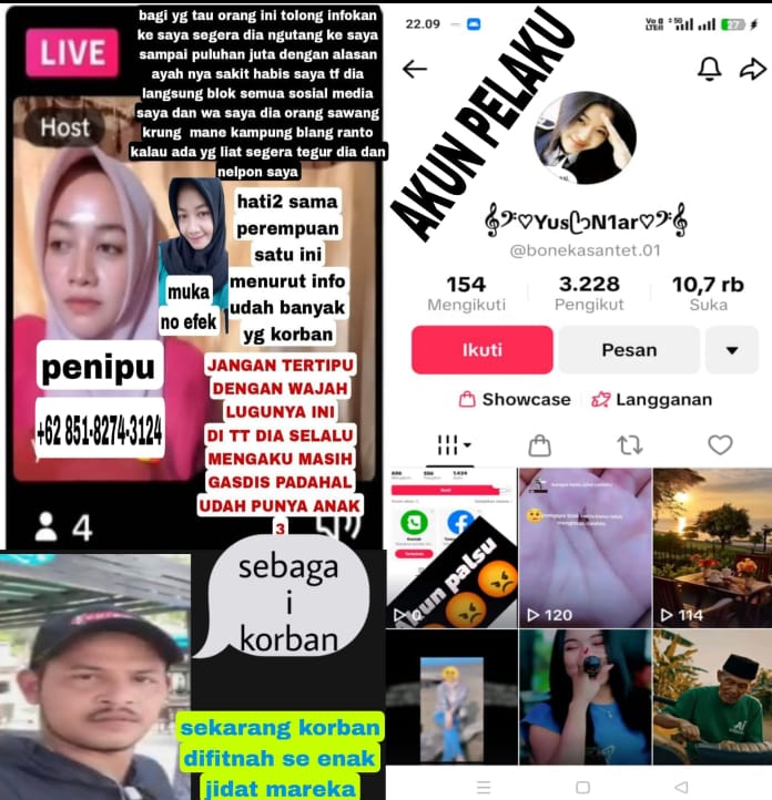 Sejumlah pengguna media sosial kembali melaporkan dugaan penipuan daring yang diduga dilakukan oleh seorang perempuan yang kerap berganti akun. Unggahan warganet yang beredar memperlihatkan kompilasi bukti visual berupa tangkapan layar siaran langsung, pesan, serta profil media sosial yang dikaitkan dengan terduga pelaku.