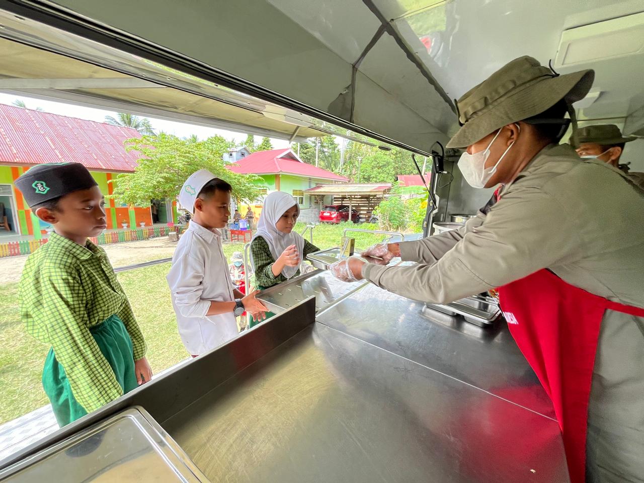 70 siswa-siswi antri satu persatu antri menuju mobil dapur lapangan Satbrimob Polda Sulteng untuk mendapatkan Makan Bergizi Gratis, didampingi oleh dewan guru serta Kepala Madrasah.