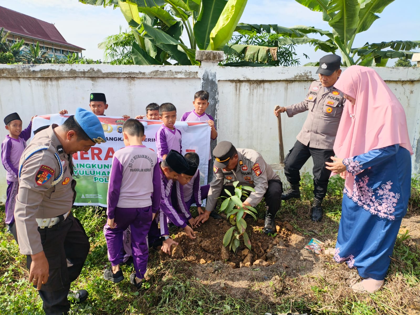 Polsek Pangkalan Kerinci, Polres Pelalawan, melaksanakan kegiatan penanaman bibit pohon di halaman Sekolah Dasar Islam Terpadu (SD-IT) Muhammadiyah, Desa Makmur, Kecamatan Pangkalan Kerinci, Kamis pagi, 9 Oktober 2025. Kegiatan ini menjadi bagian dari dukungan terhadap program penghijauan lingkungan serta kelestarian alam yang dicanangkan Kapolda Riau.