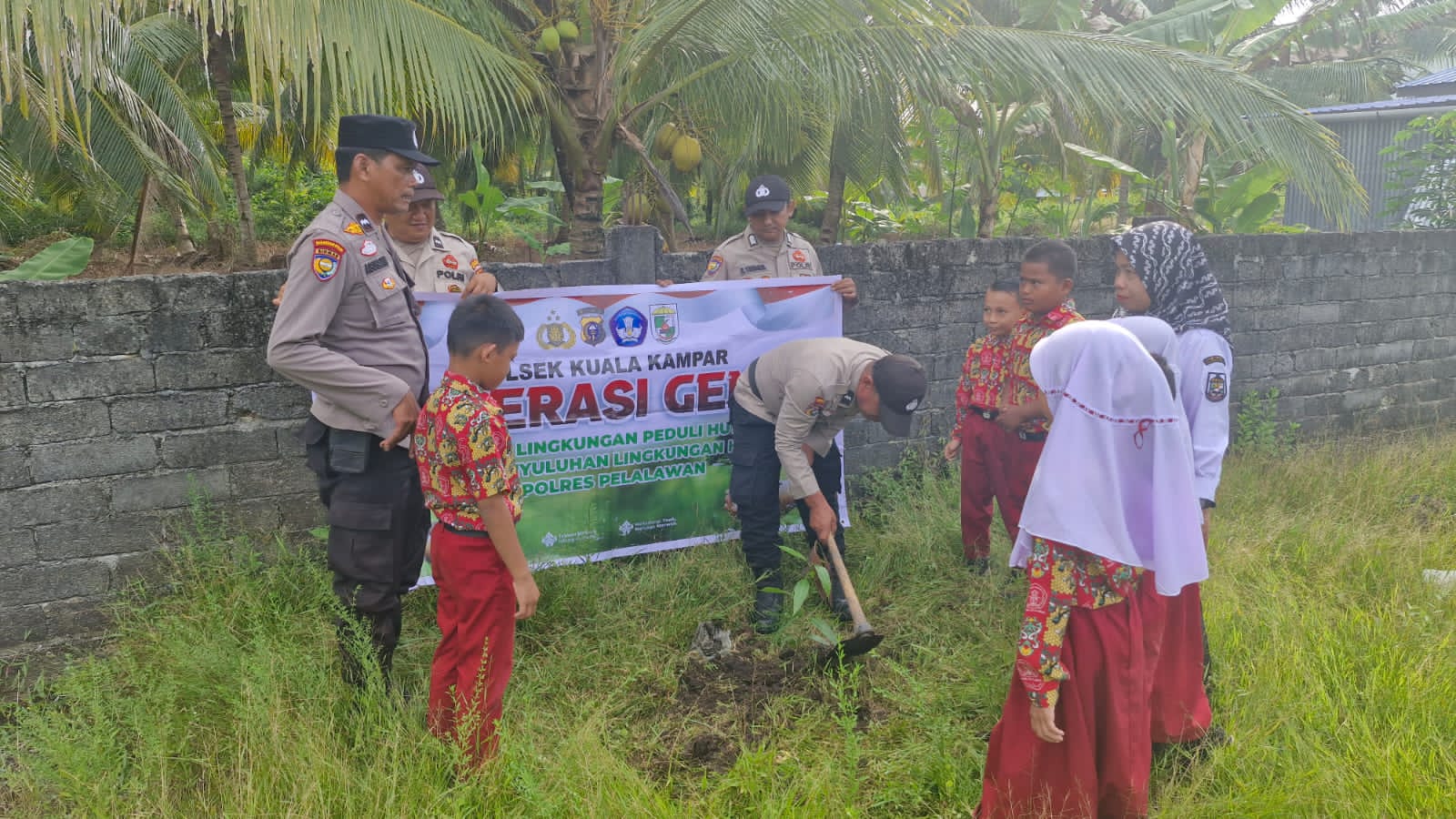 Kepolisian Resor (Polres) Pelalawan melalui Polsek Kuala Kampar melaksanakan penanaman bibit pohon mangga di lingkungan sekolah dasar sebagai bagian dari dukungan terhadap program Kapolda Riau dalam menjaga kelestarian lingkungan.