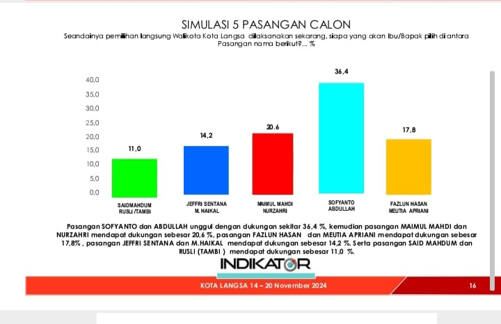 Simulasi Elektabilitas pasangan calon Walikota dan Wakil Walikota Langsa nomor urut 4 menempati urutan teratas. Simulasi yang berlangsung dari tanggal 14 – 20 November 2024, menempatkan Sofyanto dan Abdullah meraih 36,4 % suara.