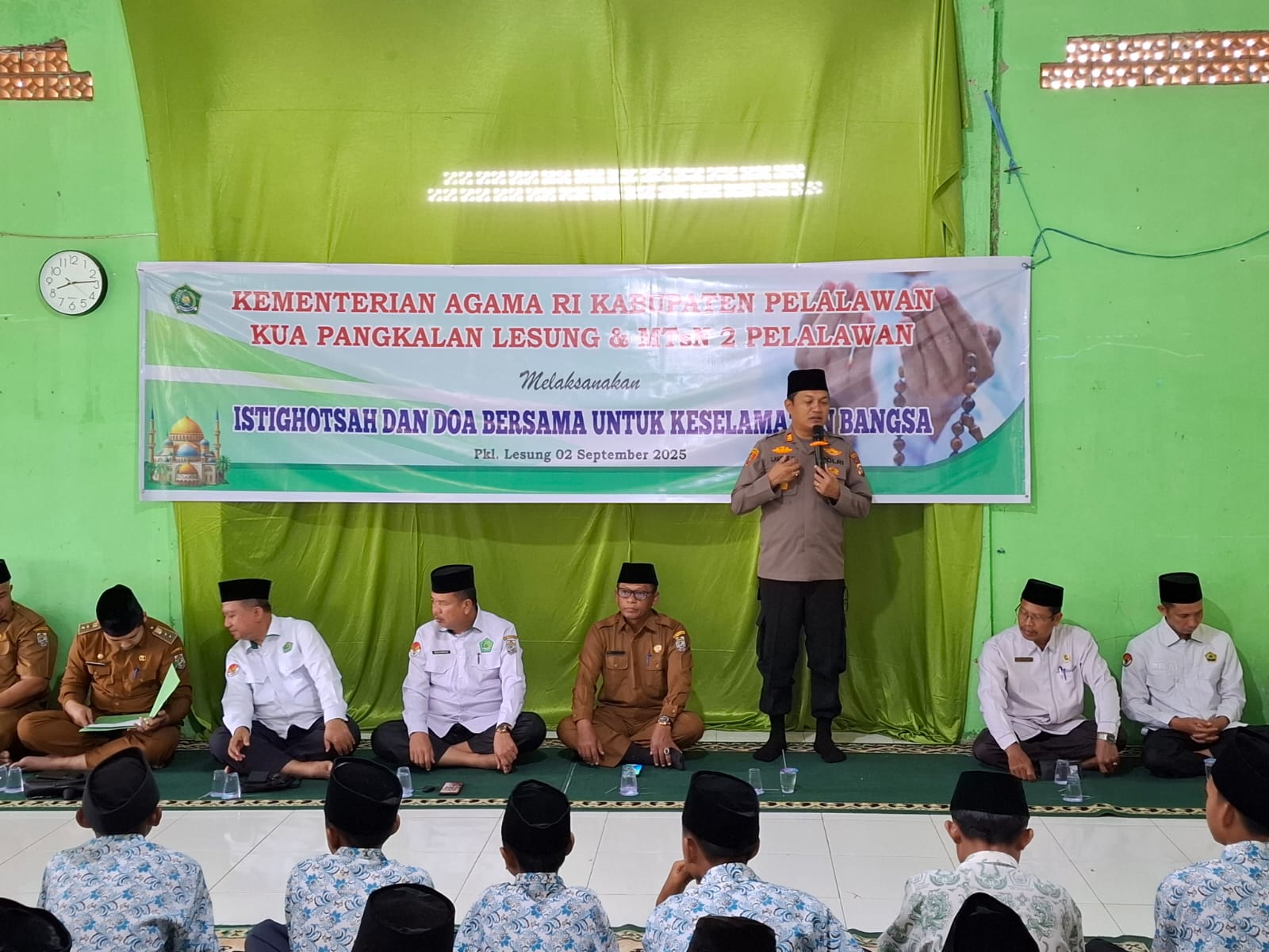 Dalam upaya memperkuat semangat persatuan dan menciptakan suasana yang aman serta damai, jajaran Forum Komunikasi Pimpinan Kecamatan (Forkompimcam) Pangkalan Lesung menggelar acara Istighotsah dan doa bersama di MTsN 2 Pelalawan, Selasa pagi, 2 September 2025.