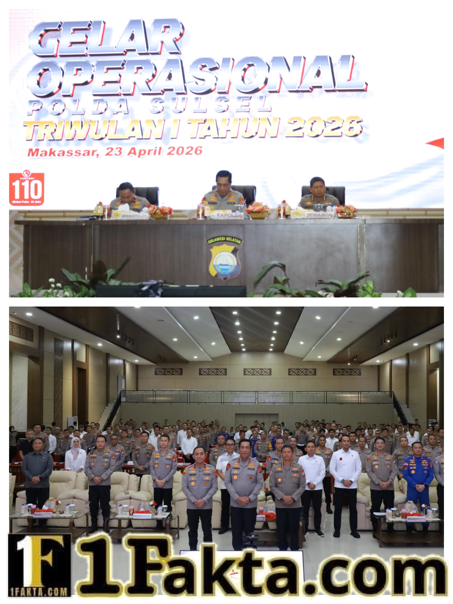 Makassar, 1fakta.com – Kapolda Sulawesi Selatan Irjen Pol. Djuhandhani Rahardjo Puro, S.H., M.H., menghadiri kegiatan Gelar Operasional Triwulan I Tahun 2026 Polda Sulsel yang dilaksanakan di Aula Mappaoddang Mapolda Sulsel, Kamis (23/04/2026).