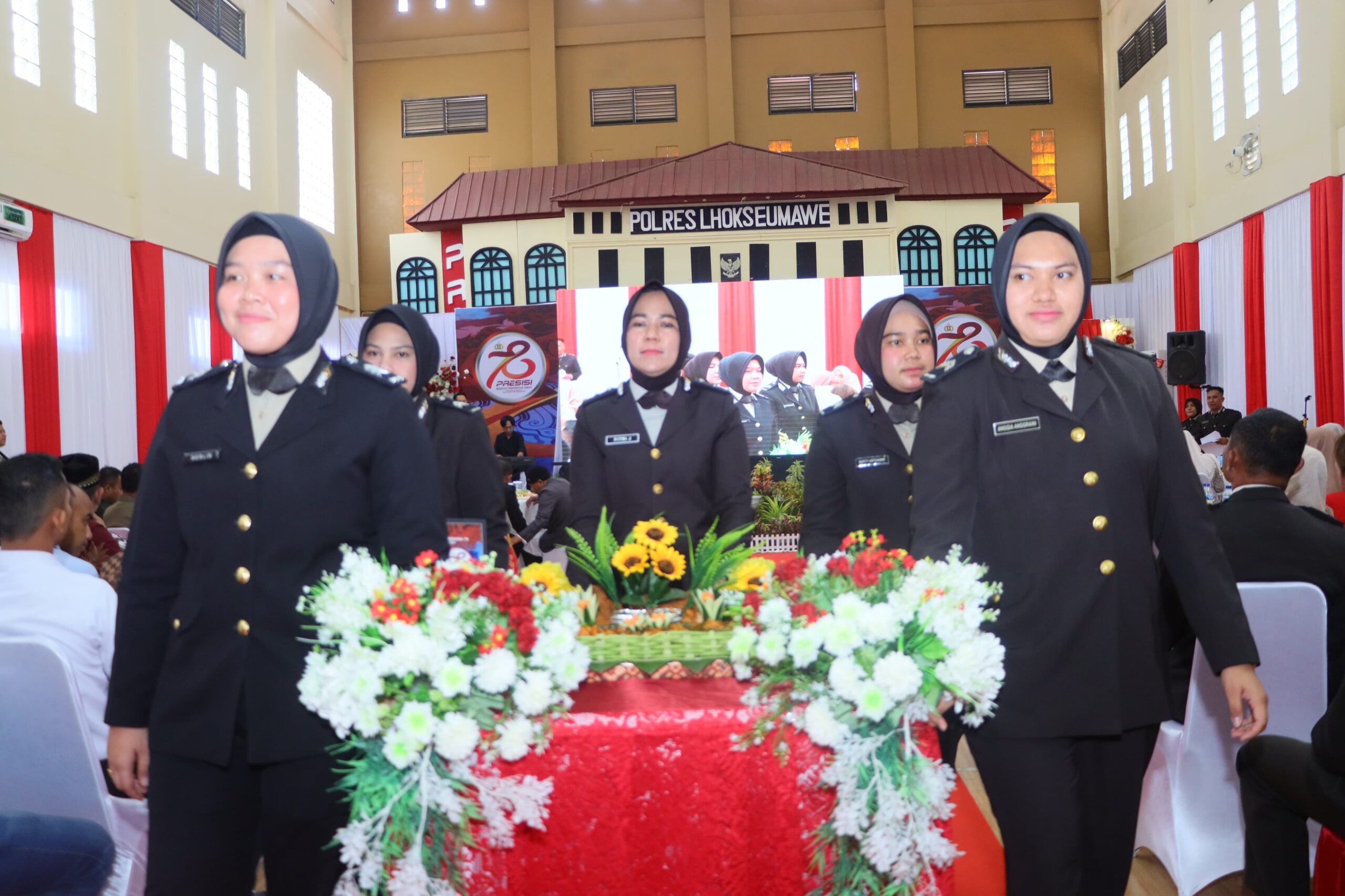 Kemudian, sebut Salman, dilanjutkan dengan sambutan dari Kapolres Lhokseumawe, pemotongan dan penyerahan tumpeng oleh Kapolres Lhokseumawe didampingi ketua Bhayangkari Lhokseumawe kepada personil tertua an. Kompol Ahmad Yani yang saat ini menjabat sebagai Kabagren Polres Lhokseumawe dan Bintara termuda Bripda Andrei Dhinata yang saat ini bertugasi di Satuan Samapta Polres Lhokseumawe.