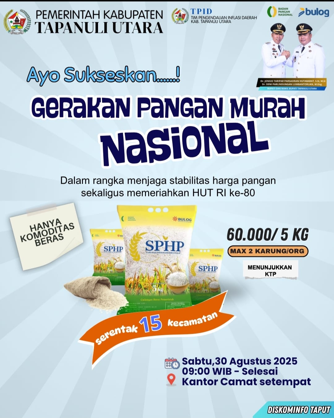 Pemerintah Kabupaten Tapanuli Utara bekerja sama dengan Badan Pangan Nasional, Perum Bulog, dan Tim Pengendalian Inflasi Daerah (TPID) Taput menggelar Gerakan Pangan Murah Nasional secara serentak di 15 kecamatan pada Sabtu, 30 Agustus 2025.
