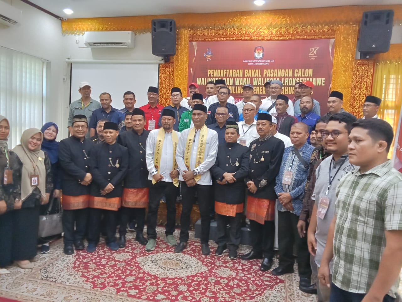Ismail dan Azhar disambut ketua KIP Kota Lhokseumawe, Abdul Hakim untuk diberikan tanda pengenal diiringi tarian Aceh.