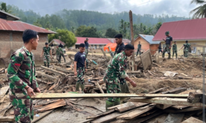 Pasca banjir bandang yang melanda sejumlah wilayah di Kabupaten Aceh Tengah, yonif TP 856/SBS yang dipimpin Danki Kapten Inf M.Habil Dan Danton Letda Inf Andy Firmansyah bersama warga kampung pantanNangka kecamatan Linge Kabupaten Aceh Tengah bersihkan material banjir di pemukiman warga dusun Binje kampung setempat,