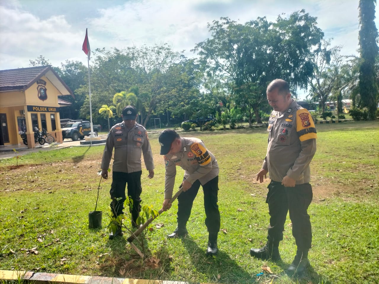 Kegiatan penanaman pohon tersebut diikuti oleh personel Polsek Ukui, di antaranya PS. KA SPKT II Polsek Ukui Aiptu Edward, Bhabinkamtibmas Desa Bagan Limau Aiptu Arfitomief, serta Bhabinkamtibmas Desa Kampung Baru Bripka Z. Zuhri, S.H. Kehadiran para personel ini menunjukkan komitmen bersama Polri dalam menjaga keseimbangan alam melalui langkah-langkah sederhana namun bermakna.