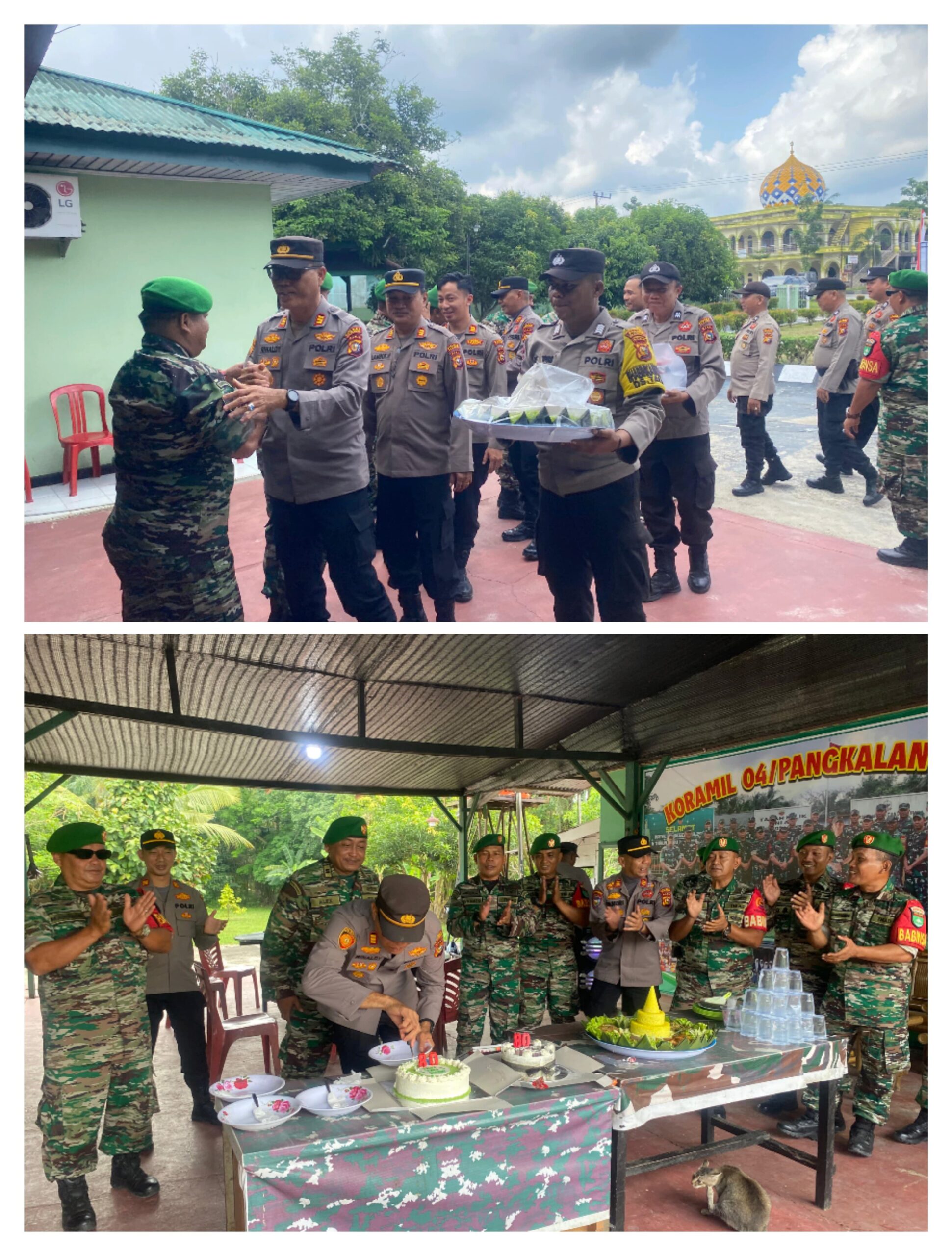 Kapolsek Pangkalan Kuras AKP Rinaldi Parlindungan, S.H., didampingi Kapolsek Pangkalan Lesung AKP Lambok Hendriko, S.H., dan Kapolsek Ukui AKP Ardi Surya Kusuma, S.T.K., S.I.K., bersama jajaran anggota dari ketiga polsek tersebut, memberikan kejutan dengan menyanyikan lagu Selamat Ulang Tahun serta menyerahkan kue dan nasi tumpeng kepada anggota Koramil 04 Pangkalan Kuras.