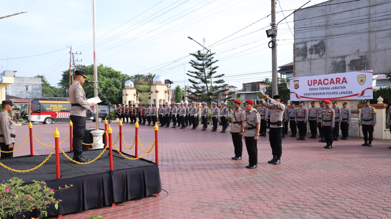 Kapolres Langsa, AKBP Andy Rahmansyah,SIK,SH,MH, memimpin upacara serah terima jabatan Kasat Reskrim Polres Langsa yang berlangsung di Lapangan Apel Mapolres Langsa pada Jumat, (9/8/2024)