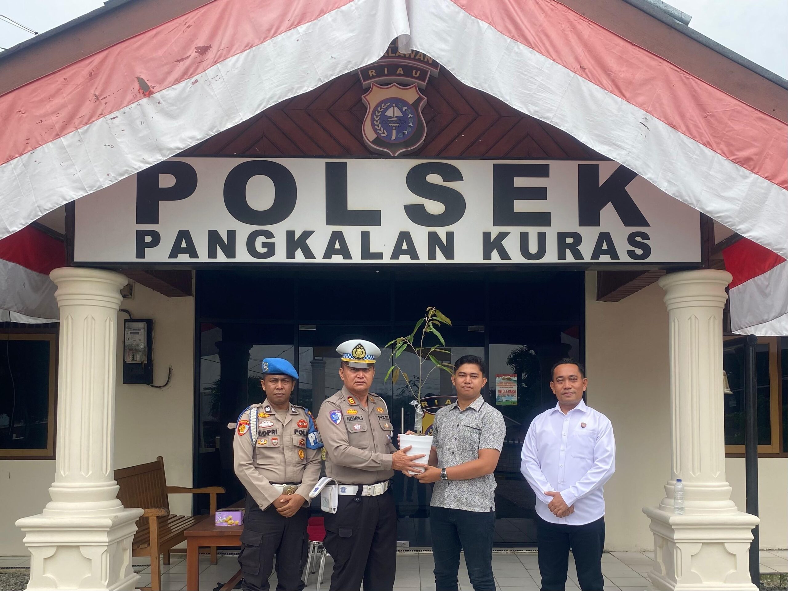 Penyerahan bibit pohon ini diwakili oleh Kanit Lantas Polsek Pangkalan Kuras AKP Hermon J., didampingi Panit Opsnal IK IPTU Deddy Tobing dan Ps. Kanit Propam AIPTU Riskopri. Bibit pohon tersebut diserahkan sebagai simbol harapan agar tumbuh subur dan memberikan manfaat bagi masyarakat serta lingkungan sekitar.