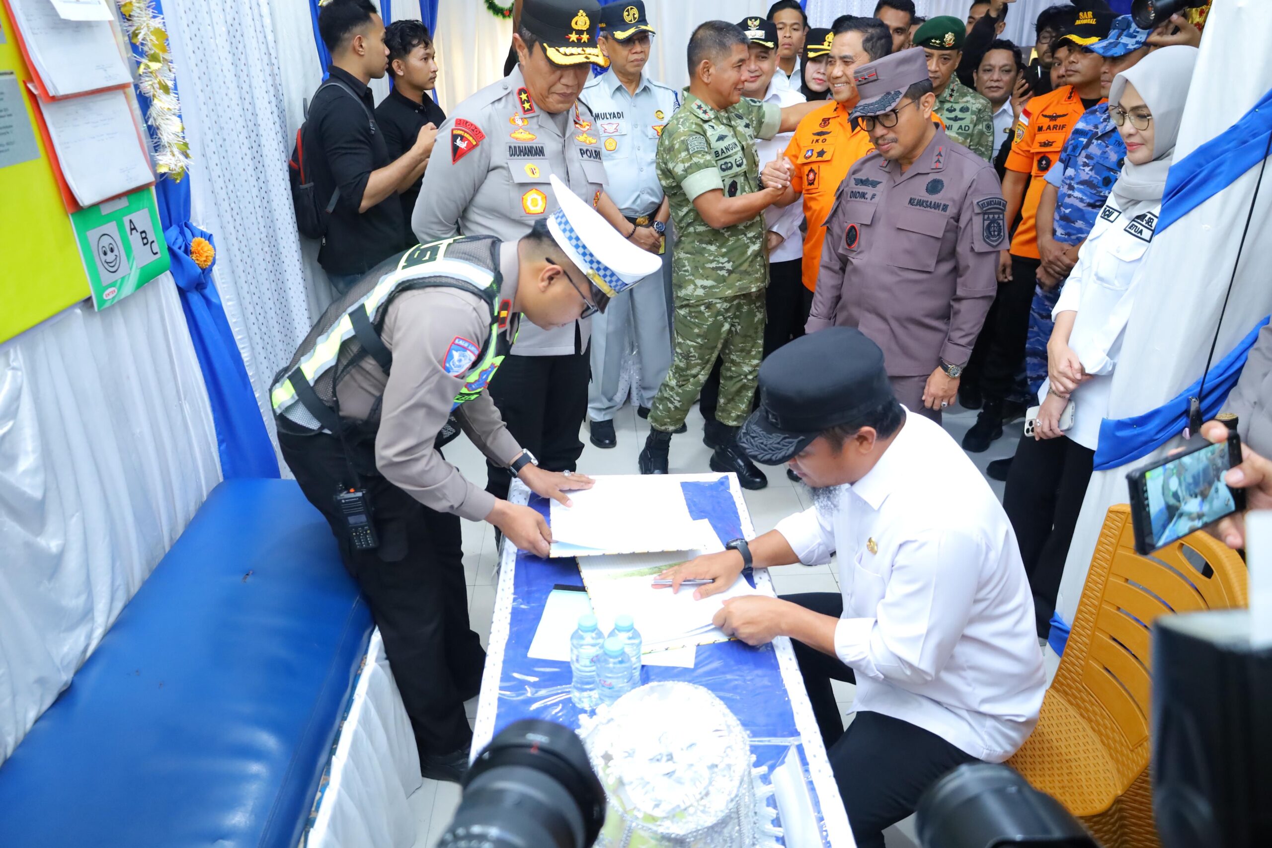 Kegiatan peninjauan dilaksanakan di Pos Pengamanan Pintu II Pelabuhan Soekarno-Hatta Makassar, Kapolda Sulsel bersama Forkopimda melakukan pemeriksaan langsung terhadap kesiapan personel, kelengkapan sarana dan prasarana, serta sistem pelayanan kepada masyarakat.