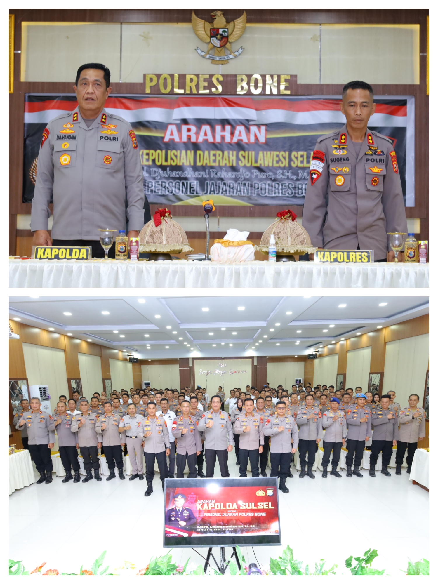 Kunjungan ini bertujuan memberikan arahan serta penguatan kepada jajaran Polres Bone dalam pelaksanaan tugas kepolisian di wilayah hukumnya.