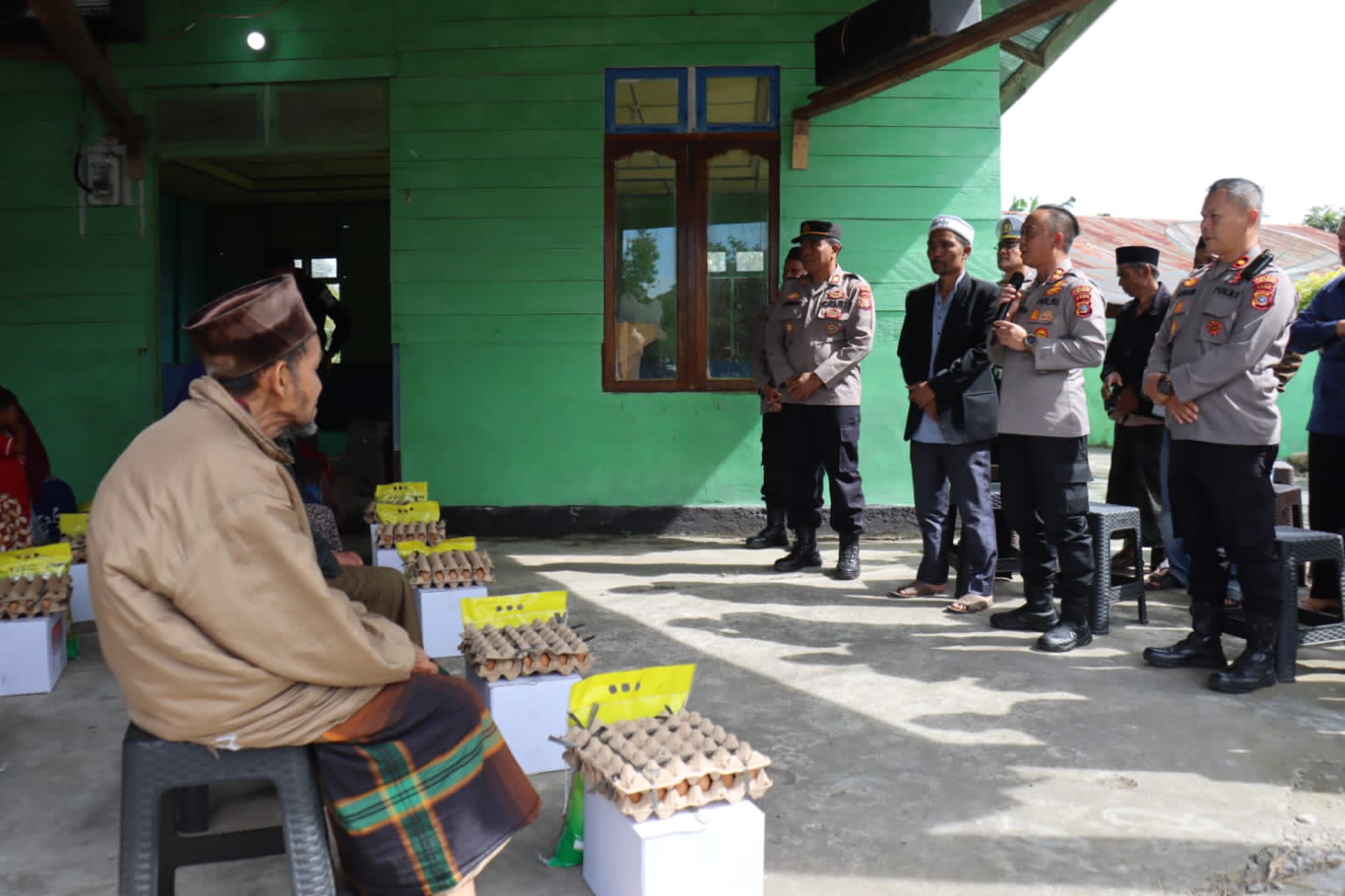 Setelah memberikan bantuan kepada tiga warga yang sakit, Kapolres beserta rombongan menyerahkan 17 paket sembako lainnya kepada warga yang telah menanti kedatangannya di halaman meunasah Al Huda. Suasana penuh kehangatan dan kekeluargaan terlihat jelas saat Kapolres menyapa satu per satu warga yang hadir.