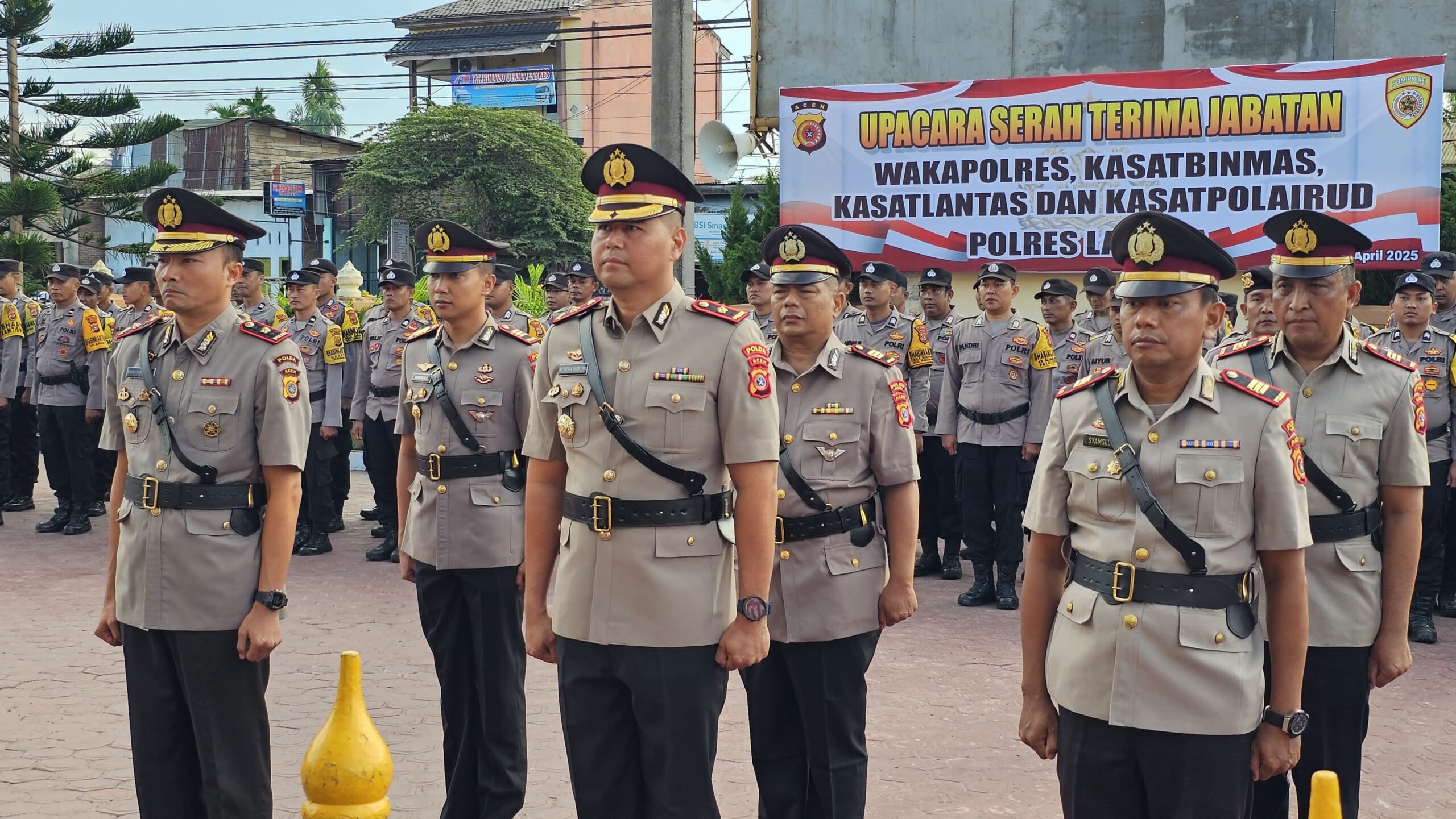 Kapolres Langsa AKBP Mughi Prasetyo SIK memimpin upacara Serah Terima Jabatan (Sertijab) sejumlah pejabat utama di Polres Langsa, yang digelar di halaman Apel Mapolres Langsa pada Rabu, 30 April 2025.