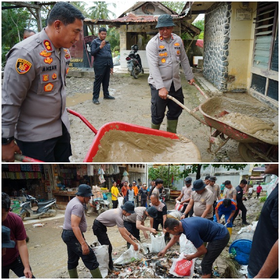 Kapolres Lhokseumawe AKBP Dr. Ahzan., S.H., S.I.K., M.S.M., M.H., mengerahkan puluhan personel untuk membersihkan sisa lumpur pascabanjir di kawasan Keude Geudong, Kecamatan Samudera, Kabupaten Aceh Utara, Kamis pagi (18/12/2025).
