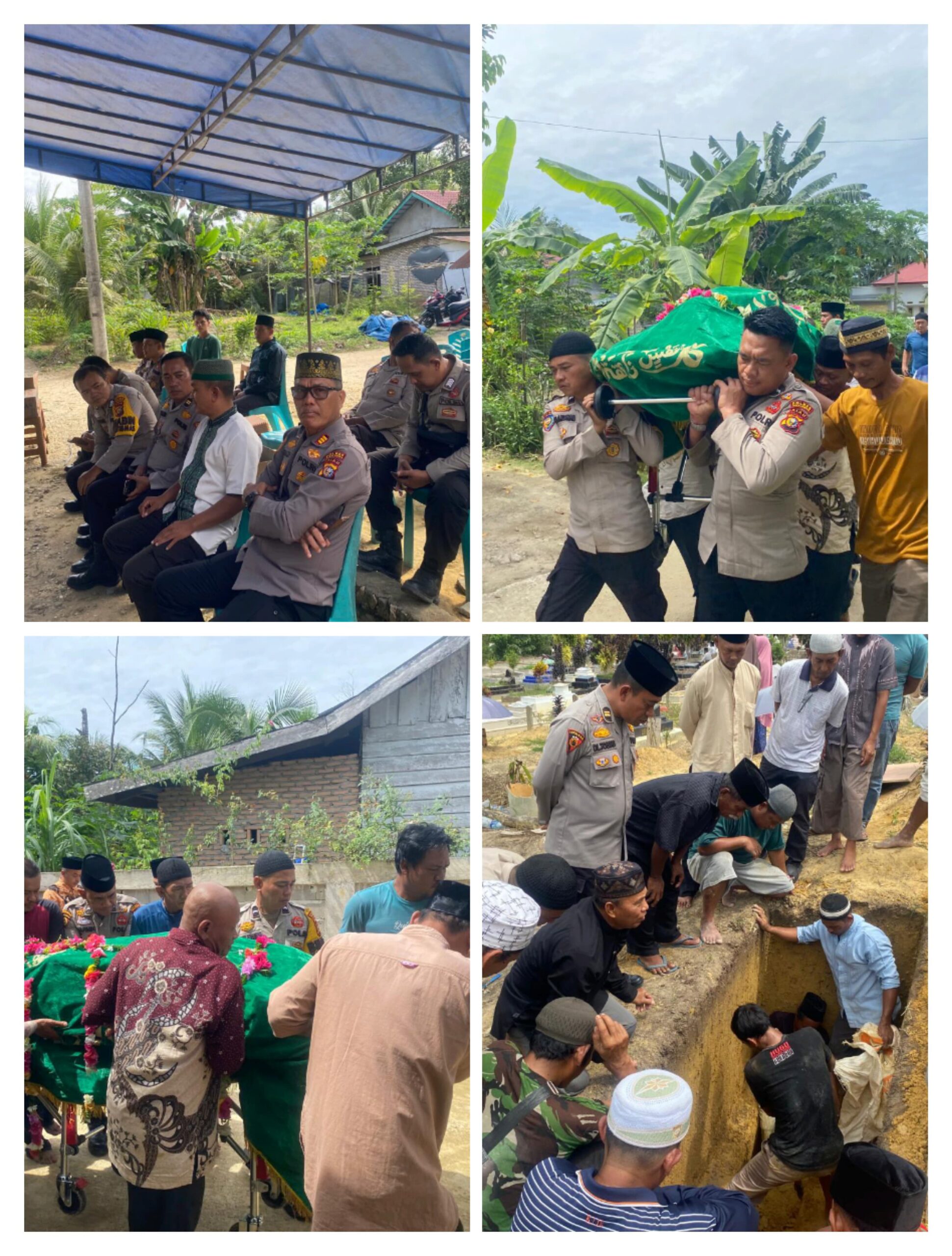 Selain menyampaikan dukungan moril dan turut berduka cita kepada keluarga almarhumah, Kapolsek dan personel juga mengikuti prosesi shalat jenazah di Masjid Ar-Rahman serta mengantarkan almarhumah ke tempat peristirahatan terakhir di Tempat Pemakaman Umum Desa Angkasa.