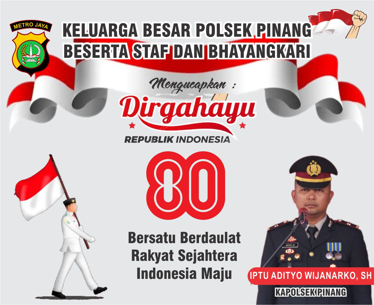 Kapolsek Pinang Kota Tangerang Iptu Adityo Wijanarko, SH beserta Staf dan Bhayangkari mengucapkan Dirgahayu Republik Indonesia ke- 80 dengan Slogan Mari Bersatu Berdaulat Rakyat Sejahtera Indonesia Maju.