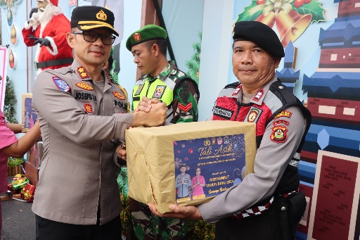 Ketua Bhayangkari Cabang Karangasem beserta pengurus turut menyerahkan paket bingkisan sebagai bentuk perhatian kepada para petugas yang tetap menjalankan kewajiban di saat masyarakat lainnya bersiap merayakan pergantian tahun.