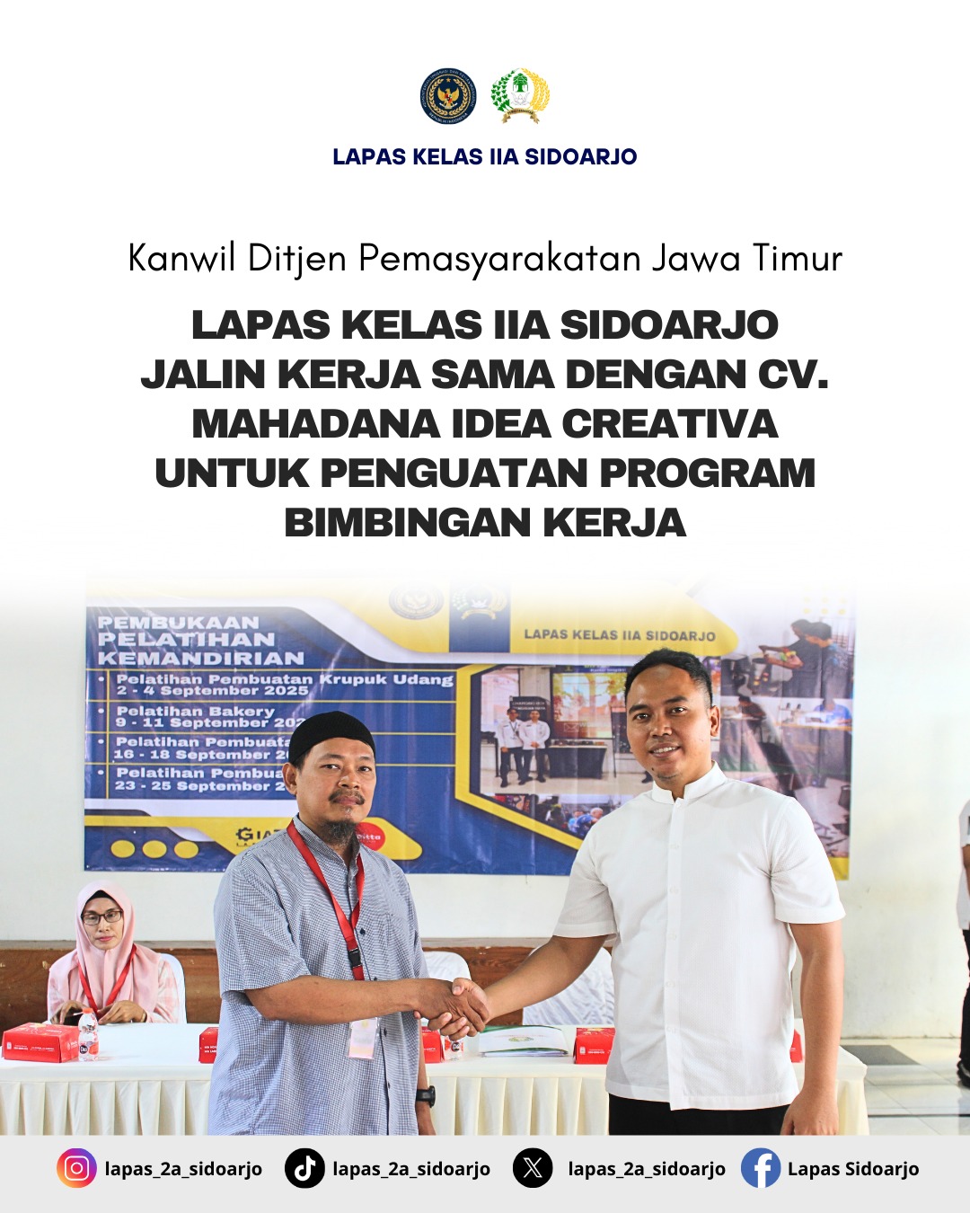 MoU ditandatangani langsung oleh Kepala Lapas Kelas IIA Sidoarjo, Disri Wulan Agus Tomo, bersama Direktur CV. Mahadana Idea Creativa, Teguh Adi Prabowo. Kerja sama ini merupakan langkah strategis dalam memperkuat program Bimbingan Kerja (Bimker) di lingkungan Lapas Sidoarjo.