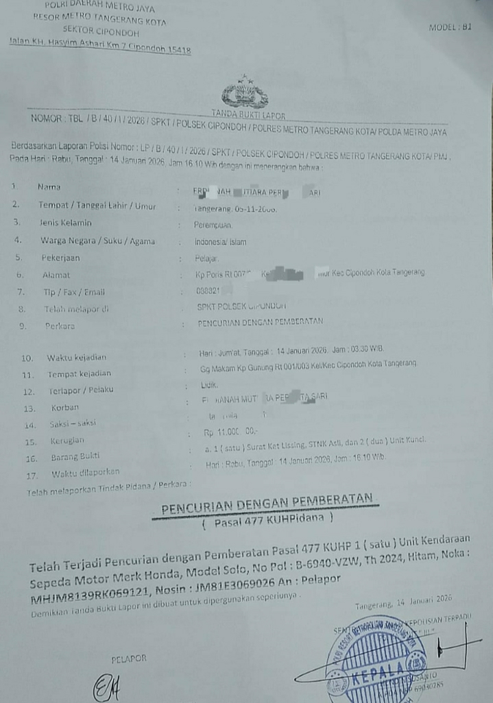 Ia menceritakan,waktu kejadian pada tanggal 02 Januari 2026 pukul 03.30 wib di kecamatan Cipondoh motornya hilang saat parkir di depan rumah.