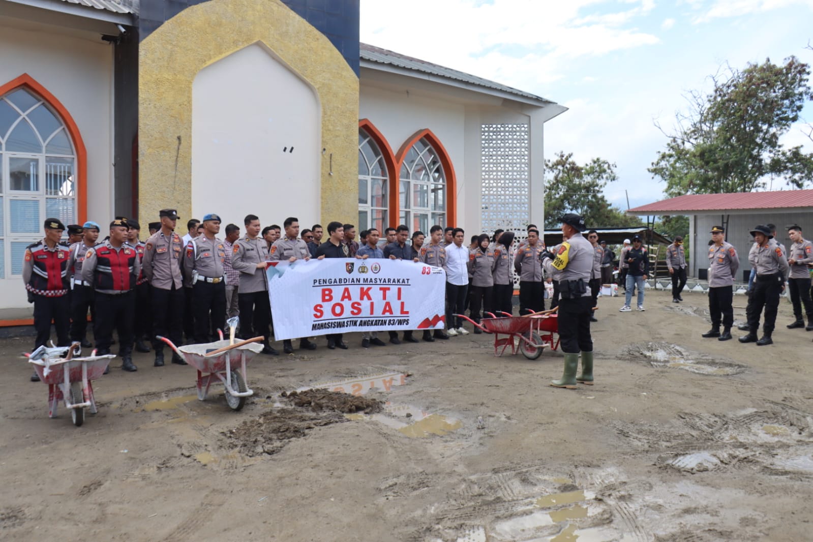 Mahasiswa Sekolah Tinggi Ilmu Kepolisian Lemdiklat Polri Angkatan 83/Widya Pratama Seva (WPS) melaksanakan kegiatan Pengabdian Masyarakat (Dianmas) berupa bakti sosial penyaluran sembako dan gotong royong pembersihan fasilitas ibadah di Kampung Mendale, Kecamatan Kebayakan, Kabupaten Aceh Tengah, Jumat (13/2/2026) mulai pukul 09.00 WIB.