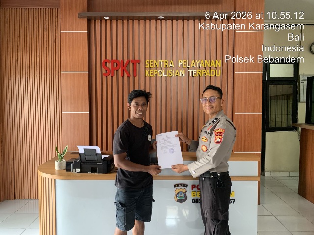 Laporan tersebut diterima langsung oleh petugas Sentra Pelayanan Kepolisian Terpadu (SPKT) Polsek Bebandem dengan nomor surat SKTLK/22/IV/2026/SPKT/POLSEK BEBANDEM/POLRES KARANGASEM/POLDA BALI.