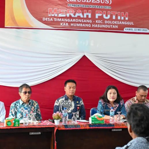 Pemerintah Desa Simangaronsang Kecamatan Doloksanggul Kabupaten Humbang Hasundutan (Humbahas) mengadakan musyawarah desa khusus dalam rangka pembentukan Koperasi Merah Putih, Kamis 22 Mei 2025. Pelaksanaan Musyawarah Desa Khusus (Musdesus) itupun dihadiri Bupati Humbahas Dr Oloan P Nababan SH MH bersama Kadis Kopenaker Nurlija Elita Pasaribu, Kadis Pertanian Junter Marbun, Plt. Kadis kesehatan P2KB dr. Gunawan Sinaga, Plt Camat Doloksanggul Manongam Pasaribu dan Kades Simangaronsang Tongam Purba