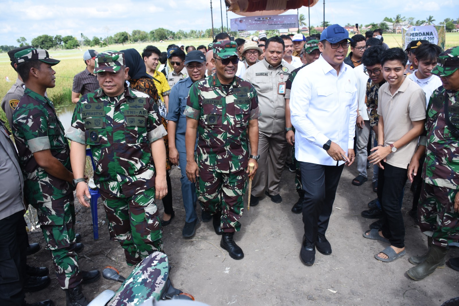 Danrem 044/Gapo Brigjen TNI Adri Koesdyanto mendampingi Wakil Menteri Pertanian Bapak Sudaryono melakukan Panen Raya di Desa Pelabuhan Dalam Kec. Pemulutan Kab. Ogan Ilir, Senin (13/1/2025).