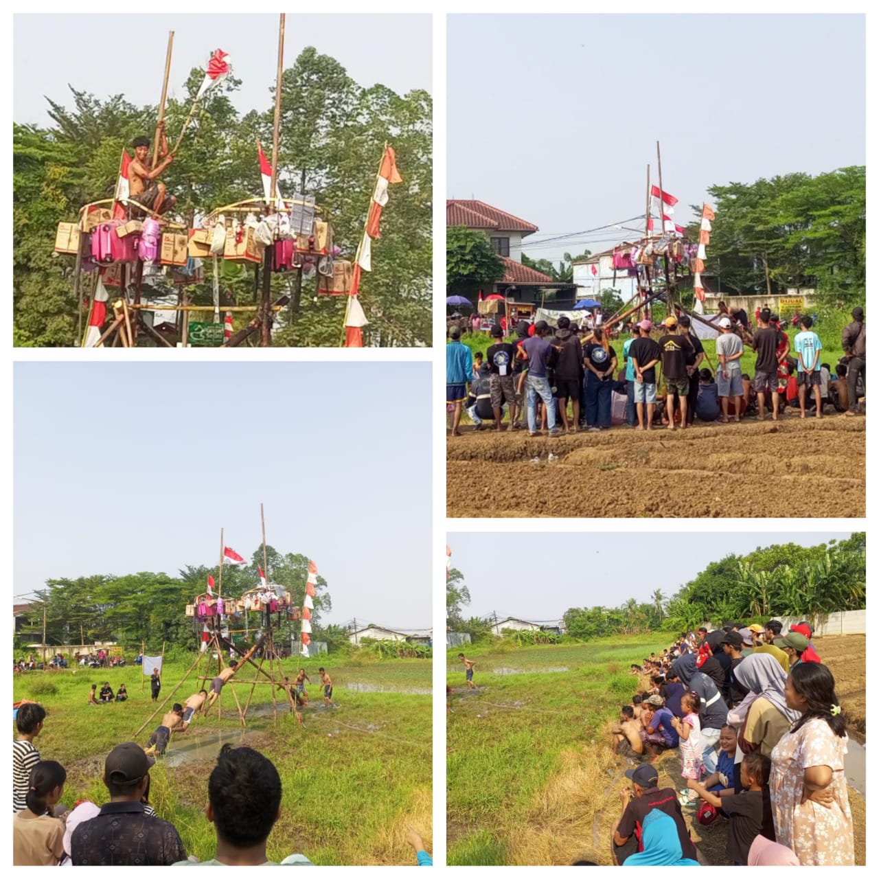 Uniknya, lomba panjat pinang ini digelar di tengah bekas sawah yang sudah tidak terpakai dengan tinggi batang pinang mencapai lima meter.