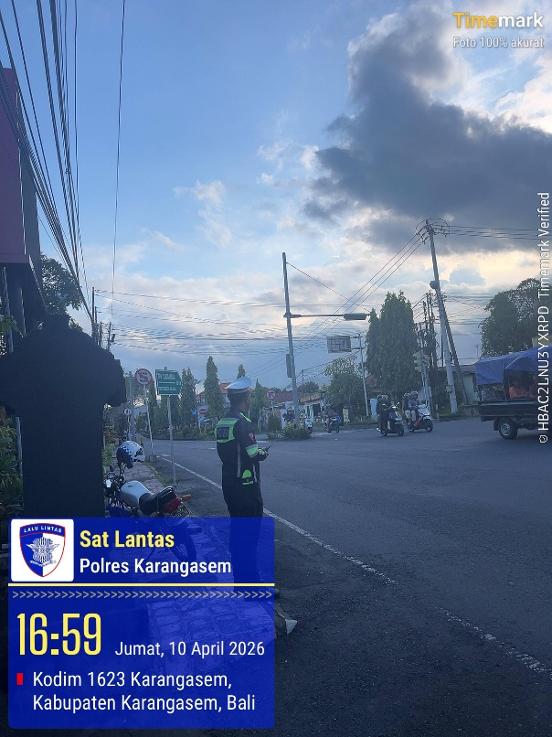 Dalam upaya menjaga dan menciptakan kelancaran arus lalu lintas di seputaran Ktl 2 simpang tiga Kodim personil satuan Lalu Lintas Polres Karangasem melaksanakan pemantauan, pengaturan dan penjagaan dipos Ktl 2 simpang tiga Kodim. Pada hari Jumat, 10 April 2026 pukul 17.00 Wita.